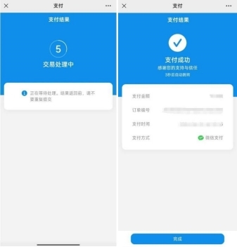 6. 选择微信后,点击下方确认支付按钮,输入支付密码进行支付,等待支付结果,成功后自动显示支付成功界面。